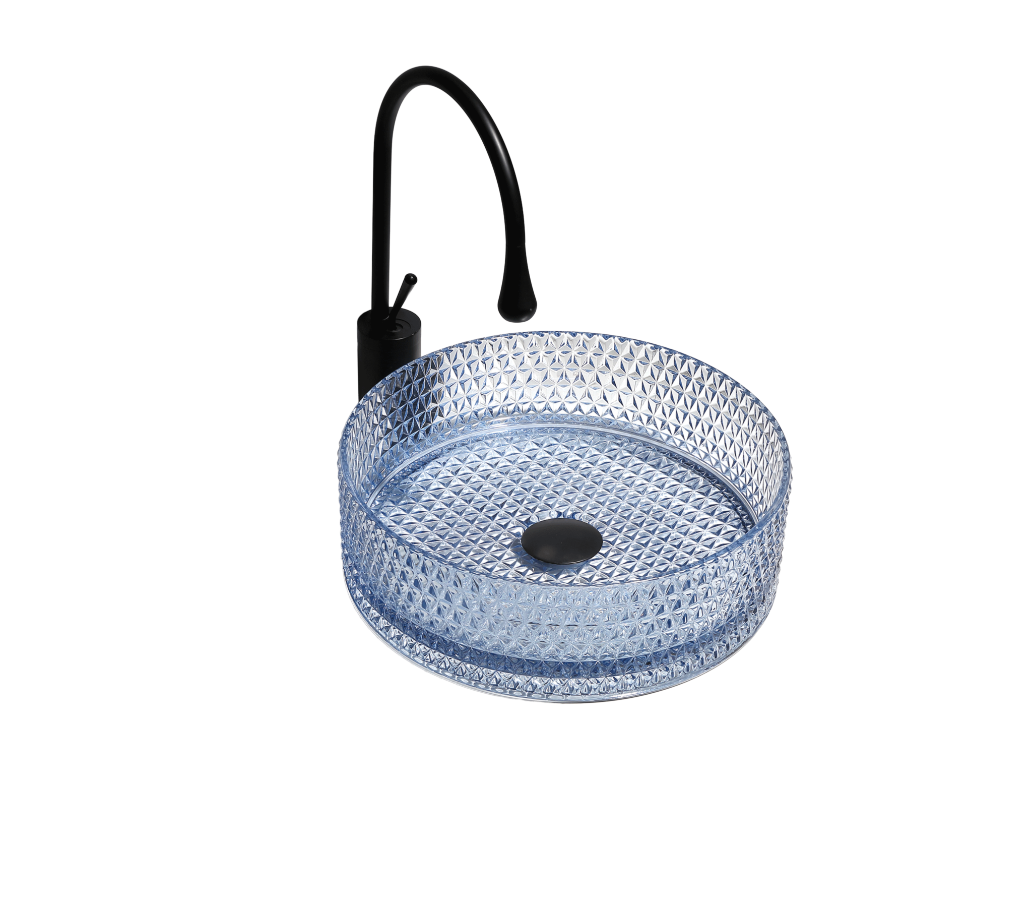 Lavoarul rotund din sticlă bleu cu model geometric Trendy’s adaugă o notă calmă și elegantă băii tale, printr-o combinație perfectă între culoarea subtilă și textura tridimensională tip diamant. Efectul de profunzime al sticlei creează un aspect sofisticat și modern, potrivit pentru interioare luminoase și aerisite.
